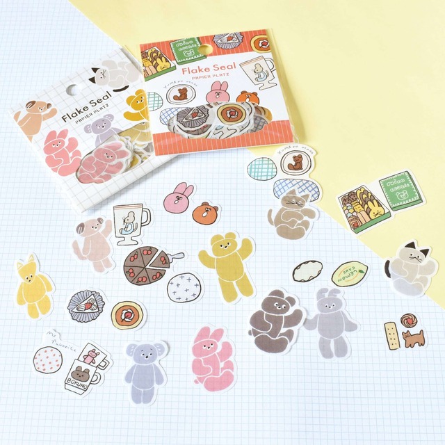 消しゴムはんこ作家Nico-Recipiさんデザインのフレークシールです。 動物達だけの・アニマル モチーフいろいろの・お菓子と食器 内容:9柄各6枚 計54 和紙シール 中国製