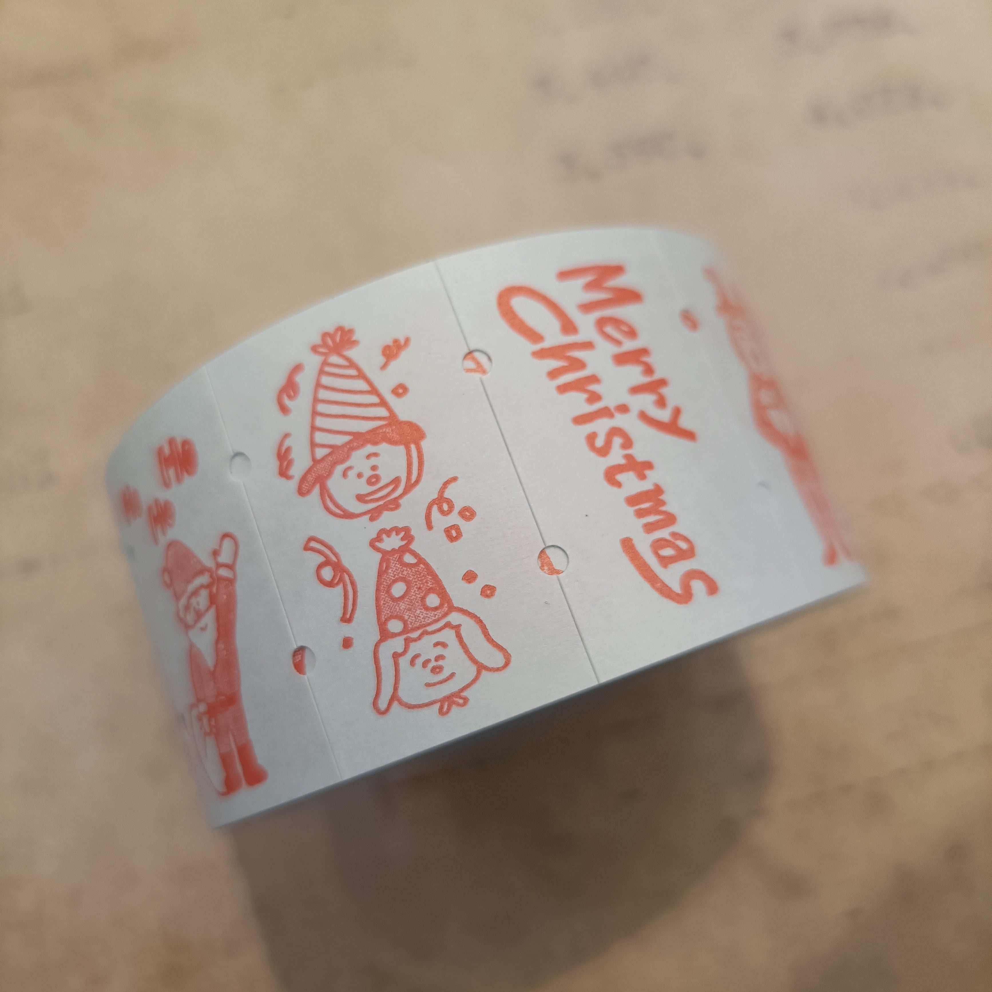 「クリスマス」のラベラーロールシール。 サブロさんのロゴや人アルファベットなどでおなじみの、ほしのしほさんイラスト。