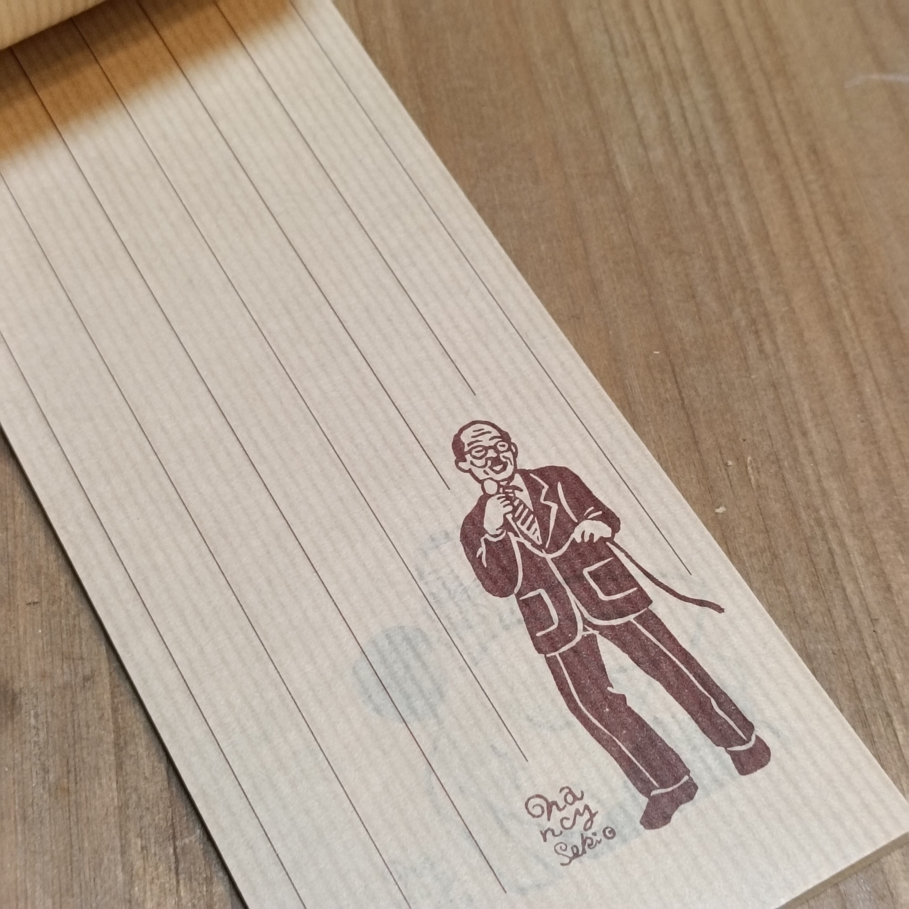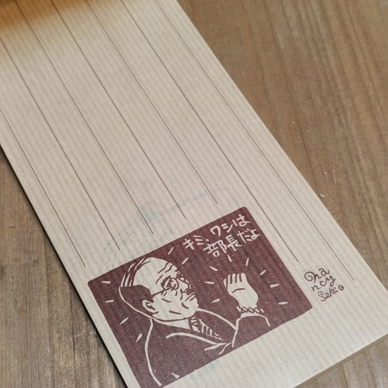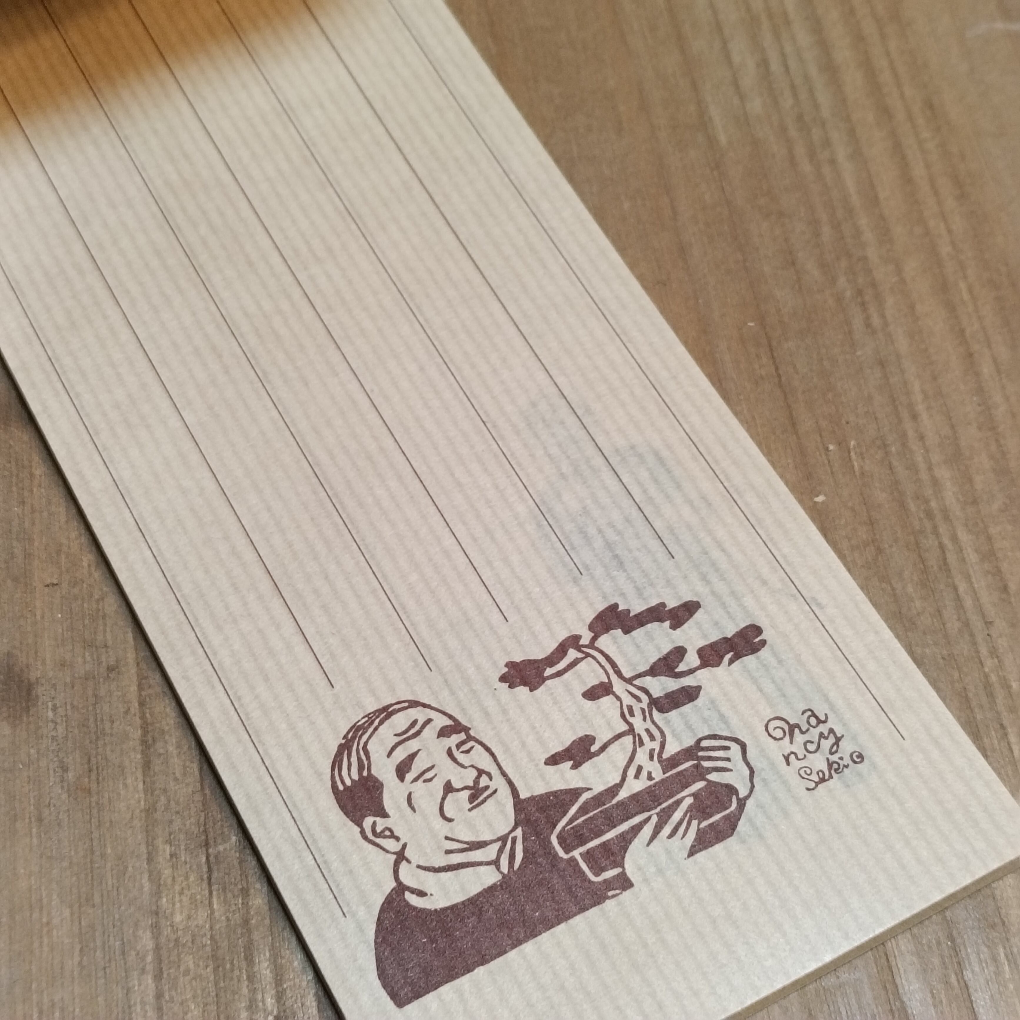 オジサマの図案と、筋入りハトロン紙のペラペラ感が哀愁マシマシの一筆箋です。