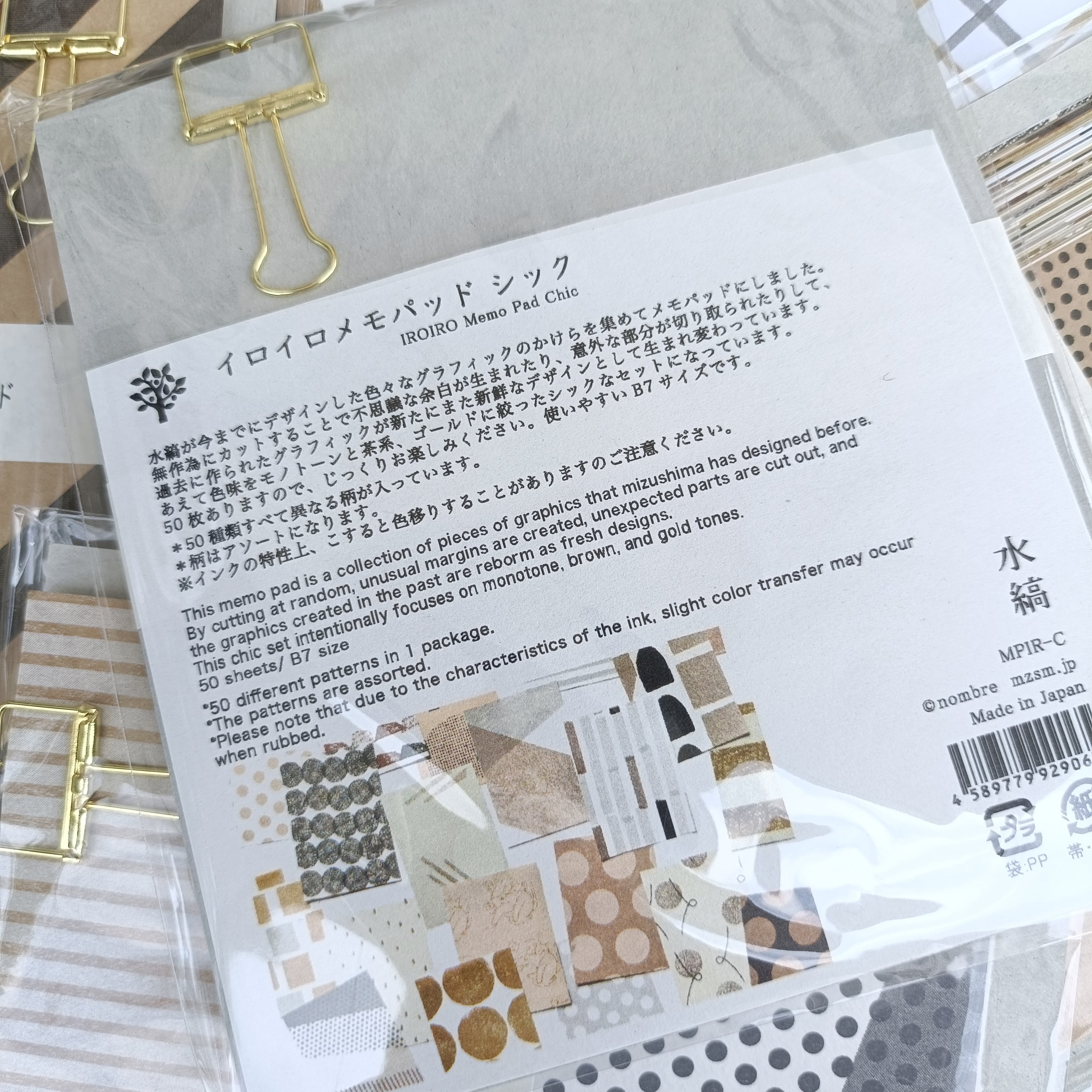 水縞さんが今までにデザインした色々なグラフィックのかけらを集めてメモパッドになりました。色味がモノトーンと茶系、ゴールドに絞ったシックなセットになっています。